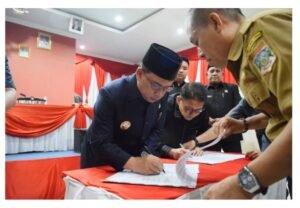 Rapat paripurna ditutup dengan persetujuan seluruh anggota DPRD yang hadir untuk menetapkan Raperda APBD 2024 menjadi Perda, ditandai dengan penandatanganan berita acara oleh Bupati dan pimpinan DPRD. (ADV/JADIDI)