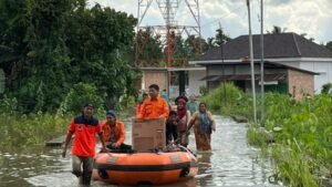 MURATARA – Khawatir debit air terus naik, Tim Badan Penanggulangan Bencana Daerah (BPBD) Kabupaten Musi Rawas Utara (Muratara) mulai evakuasi warga dengan perahu karet.